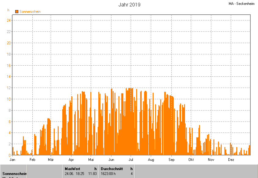 Dargestellt wird die grafische Übersicht für die Sonnenscheinzeit. Zu sehen sind immer die täglichen Zeiten (von 0-24 Uhr):
