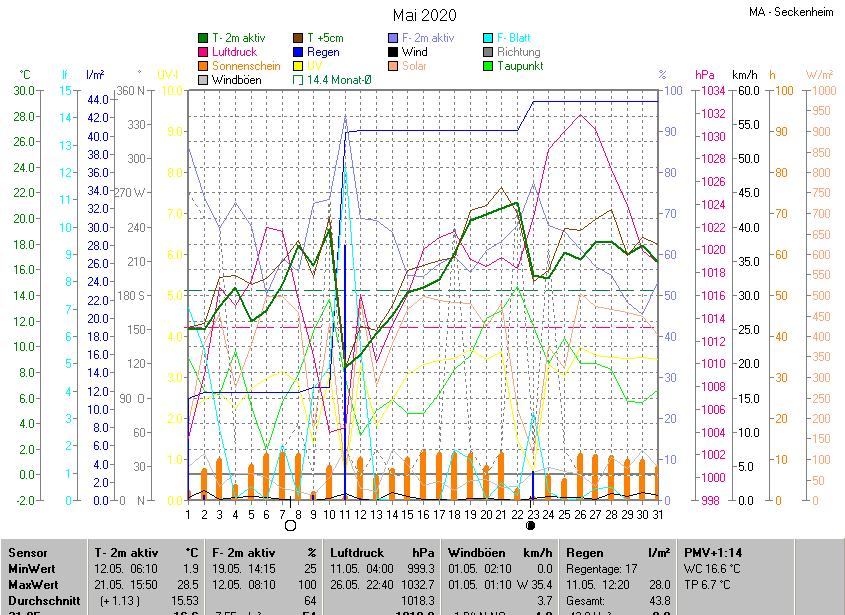 Der wärmste Tag war der 21.05.2020 um 15:50 mit 28.5°C. Am kältesten war es mit 1.9°C am 12.05.2020 um 06:10.