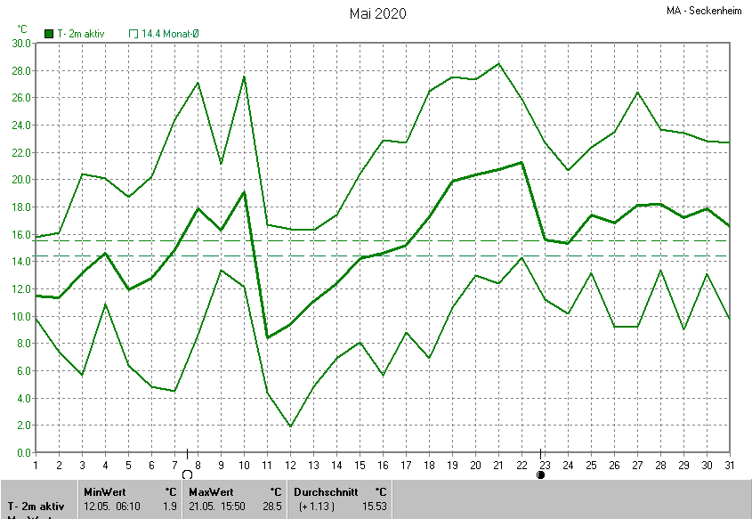 Die Durchschnittstemperatur für den Monat Mai 2020 lag bei 15.53°C. Die Abweichung vom langjährigen Mittel war +1.13°C.