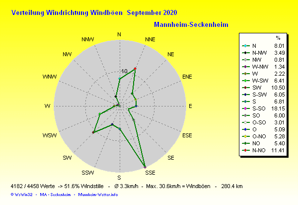 Die Durchschnittstemperatur für den Monat September 2020 lag bei 17.58°C. Die Abweichung vom langjährigen Mittel war +2.28°C.
