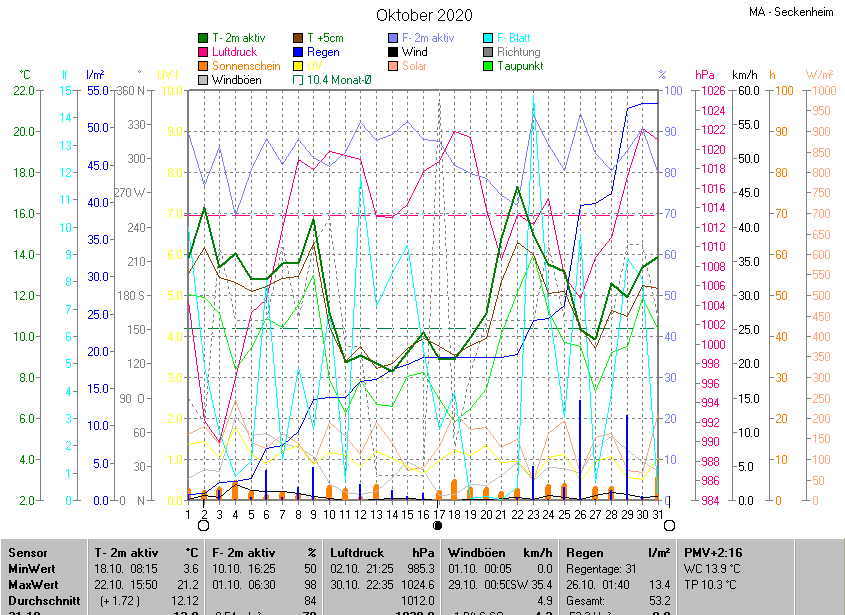 Der wärmste Tag war der 22.10.2020 um 15:50 mit 21.2°C. Am kältesten war es mit 3.6°C am 18.10.2020 um 08:15.