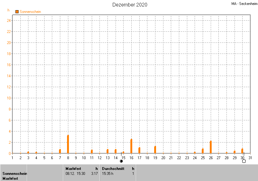Dargestellt wird die grafische Übersicht für die Sonnenscheinzeit. Zu sehen sind immer die täglichen Sonnenstunden (von 0-24 Uhr):