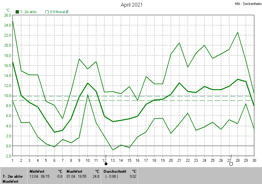 Die Durchschnittstemperatur für den Monat April 2021 lag bei 9.02°C. Die Abweichung vom langjährigen Mittel war -0.88°C.