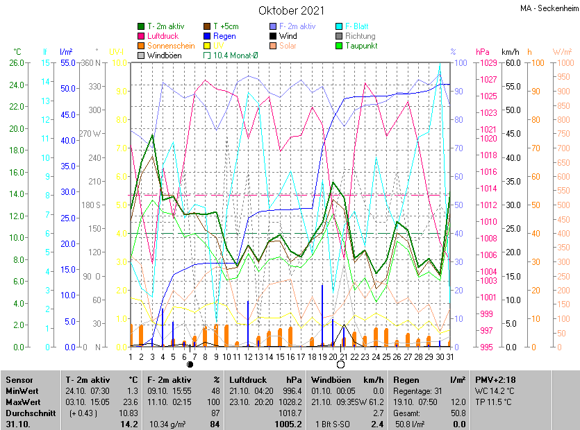 Die Durchschnittstemperatur für den Monat Oktober 2021 lag bei 10.83°C. Die Abweichung vom langjährigen Mittel war +0.43°C.