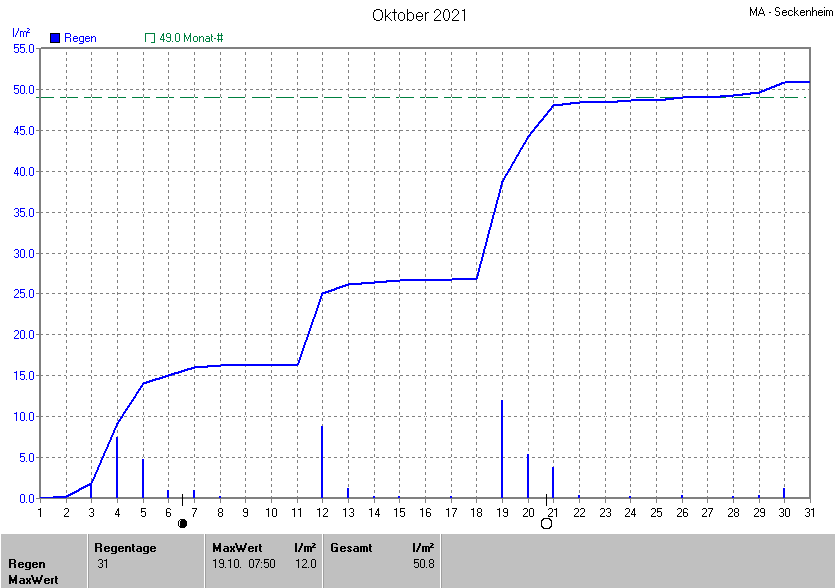 Die gesamte Regenmenge lag bei 50.8l/m² (entspricht: 103.7%) und war damit um +1.8l/m² vom langjährigen Wert entfernt. Niederschlag gab es an 21Tagen. Mehr als 2mm Regen gab es an 6Tagen. Sehr viel Regen mit mehr als 20mm pro Tag gab es an 0Tagen.