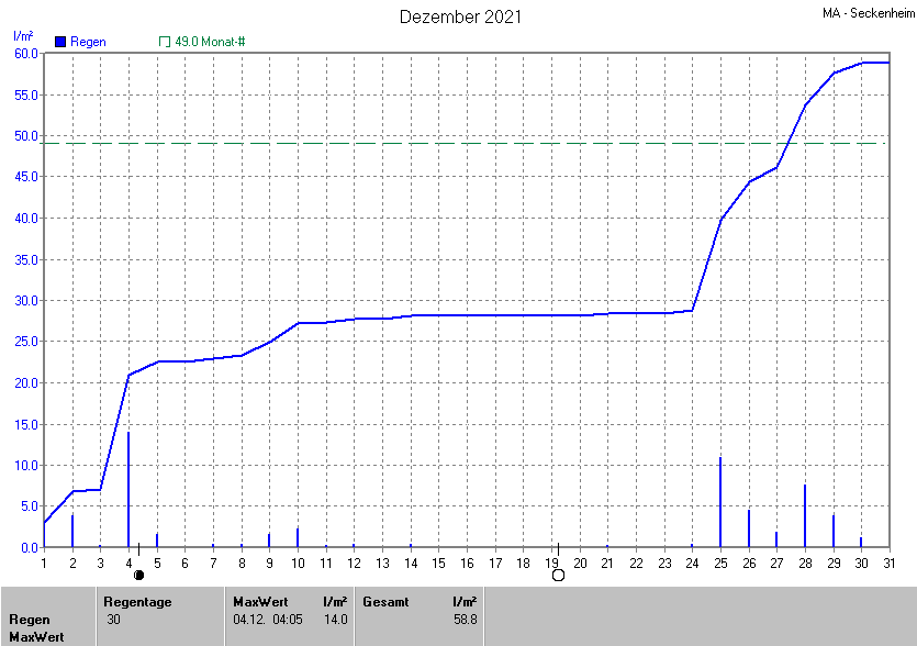 Die Durchschnittstemperatur für den Monat Dezember 2021 lag bei 5.19°C. Die Abweichung vom langjährigen Mittel war +2.99°C.