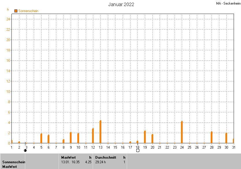 Dargestellt wird die grafische Übersicht für die Sonnenscheinzeit. Zu sehen sind immer die täglichen Sonnenstunden (von 0-24 Uhr):