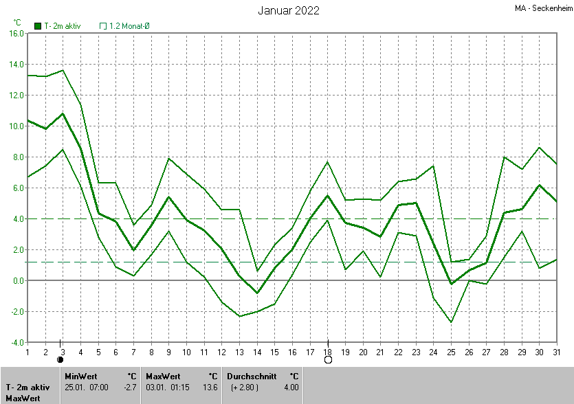 Die Durchschnittstemperatur für den Monat Januar 2022 lag bei 4.00°C. Die Abweichung vom langjährigen Mittel war +2.80°C.