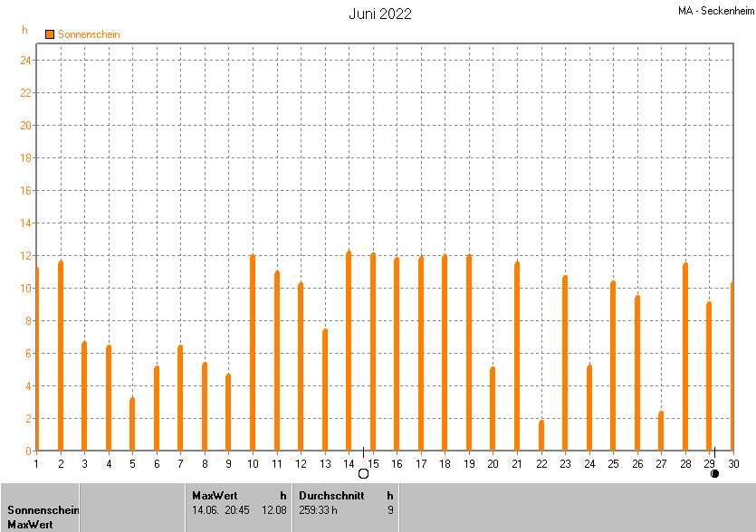 Dargestellt wird die grafische Übersicht für die Sonnenscheinzeit. Zu sehen sind immer die täglichen Sonnenstunden (von 0-24 Uhr):