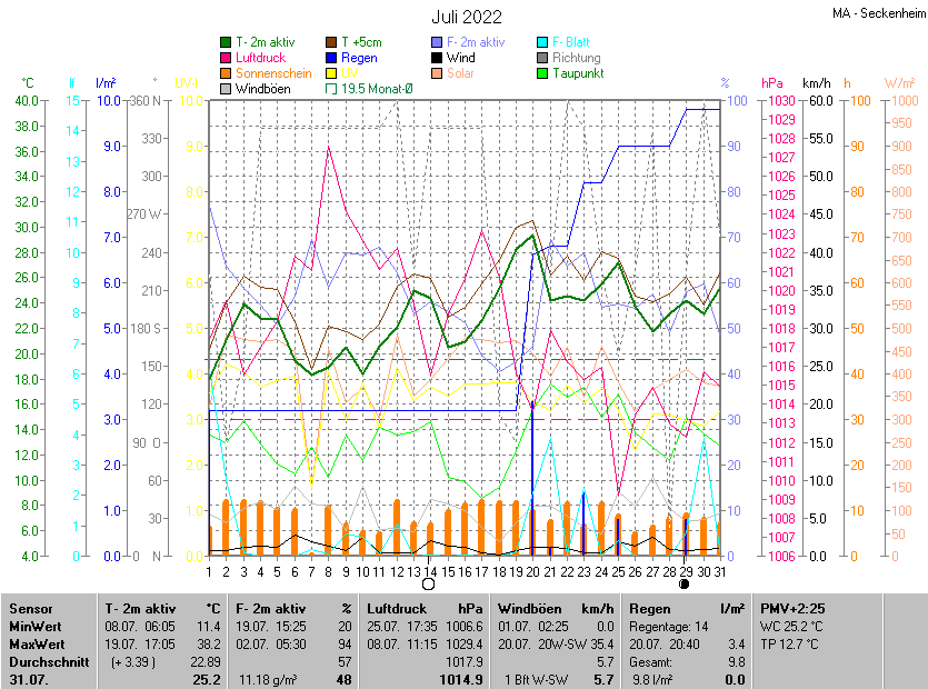 Der wärmste Tag war der 19.07.2022 um 17:05 mit 38.2°C. Am kältesten war es mit 11.4°C am 08.07.2022 um 06:05.