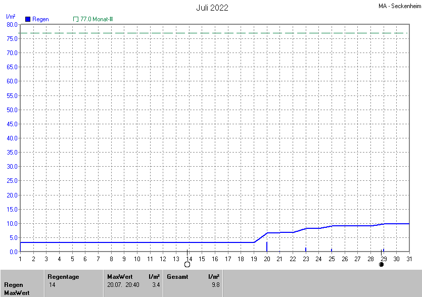 Die gesamte Regenmenge lag bei 9.8l/m² (entspricht: 12.7%) und war damit um -67.2l/m² vom langjährigen Wert entfernt. Niederschlag gab es an 6Tagen. Mehr als 2mm Regen gab es an 2Tagen. Sehr viel Regen mit mehr als 20mm pro Tag gab es an 0Tagen.