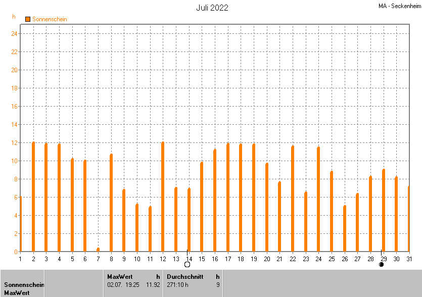 Dargestellt wird die grafische Übersicht für die Sonnenscheinzeit. Zu sehen sind immer die täglichen Sonnenstunden (von 0-24 Uhr):