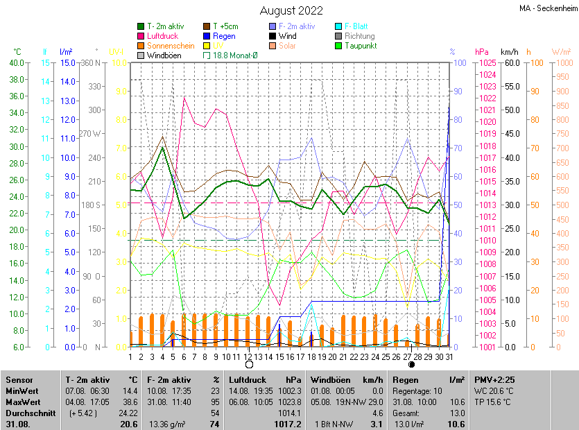 Die Durchschnittstemperatur für den Monat August 2022 lag bei 24.22°C. Die Abweichung vom langjährigen Mittel war +5.42°C.