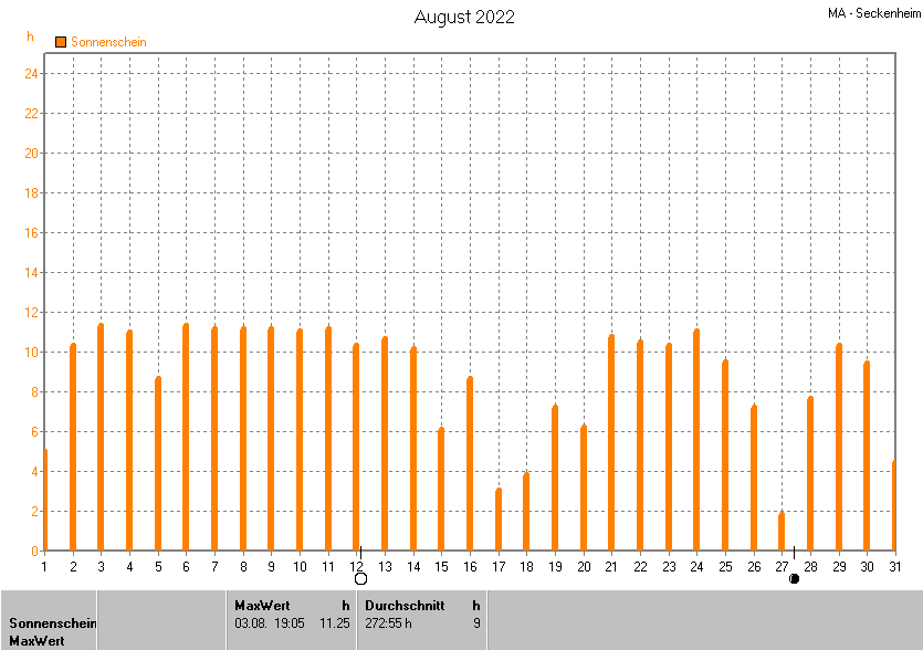 Dargestellt wird die grafische Übersicht für die Sonnenscheinzeit. Zu sehen sind immer die täglichen Sonnenstunden (von 0-24 Uhr):