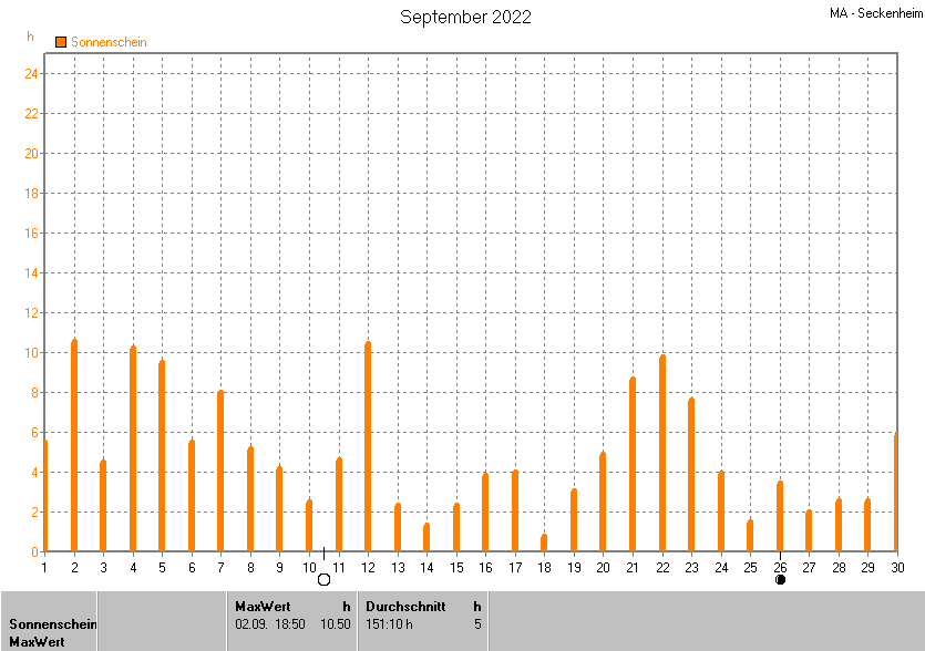 Dargestellt wird die grafische Übersicht für die Sonnenscheinzeit. Zu sehen sind immer die täglichen Sonnenstunden (von 0-24 Uhr):