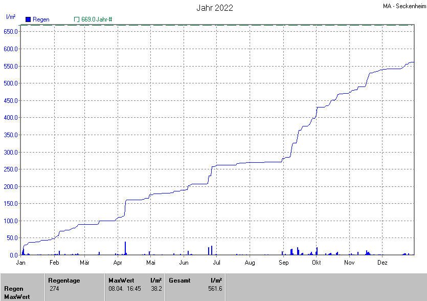 Die gesamte Regenmenge lag bei 561.6l/m² ( 83.9%) und war damit um -107.4l/m² vom langjährigen Wert entfernt. Niederschlag gab es an 163Tagen. Mehr als 2mm Regen gab es an 68Tagen. Sehr viel Regen mit mehr als 20mm pro Tag gab es an 5Tagen.