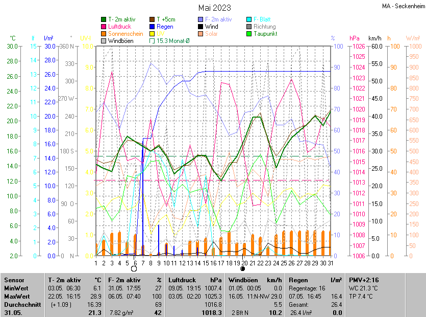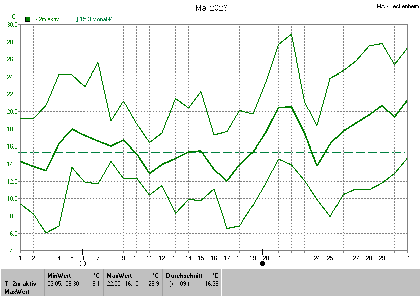Die Durchschnittstemperatur für den Monat Mai 2023 lag bei 16.38°C. Die Abweichung vom langjährigen Mittel war +1.08°C.