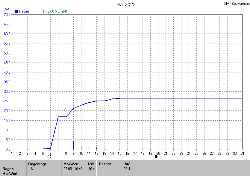 Die gesamte Regenmenge lag bei 26.4l/m² (entspricht: 39.1%) und war damit um -41.2l/m² vom langjährigen Wert entfernt. Niederschlag gab es an 9Tagen. Mehr als 2mm Regen gab es an 2Tagen. Sehr viel Regen mit mehr als 20mm pro Tag gab es an 0Tagen.