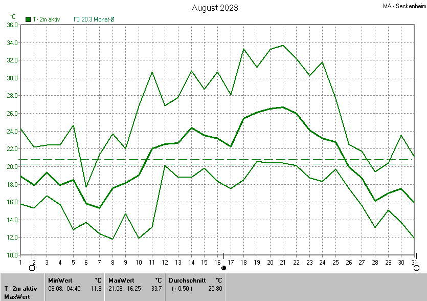 Die Durchschnittstemperatur für den Monat August 2023 lag bei 20.80°C. Die Abweichung vom langjährigen Mittel war +0.50°C.