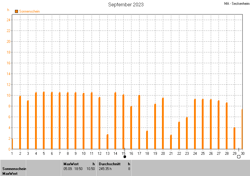 Die gesamte Sonnenscheinzeit lag bei 245:35 Stunden (entspricht: 144.7%) und war damit um +75:50h vom langjährigen Wert entfernt.