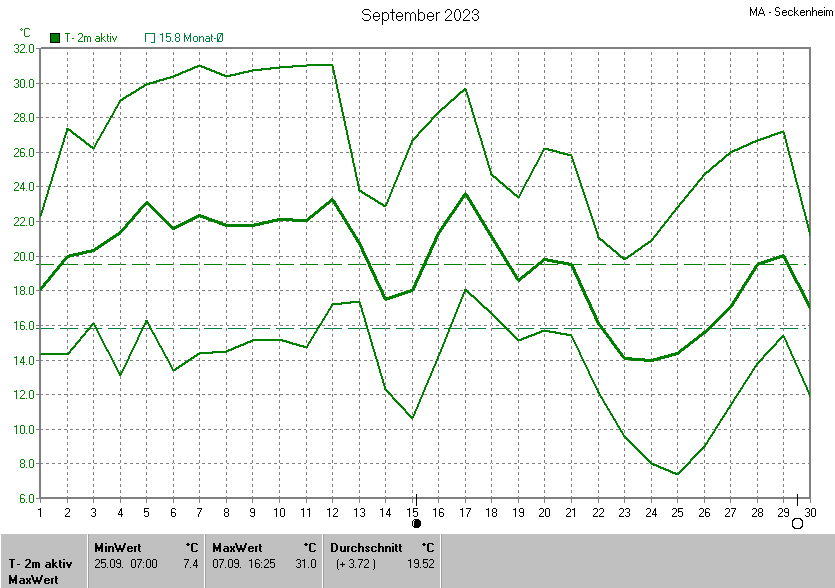 Der wärmste Tag war der 07.09.2023 um 16:25 mit 31.0°C. Am kältesten war es mit 7.4°C am 25.09.2023 um 07:00.