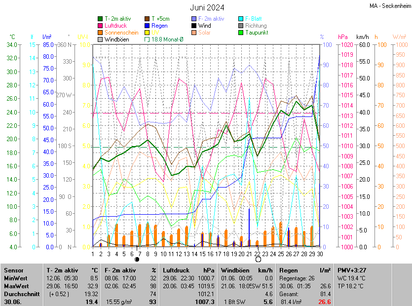 Die Durchschnittstemperatur für den Monat Juni 2024 lag bei 19.34°C. Die Abweichung vom langjährigen Mittel war +0.54°C.