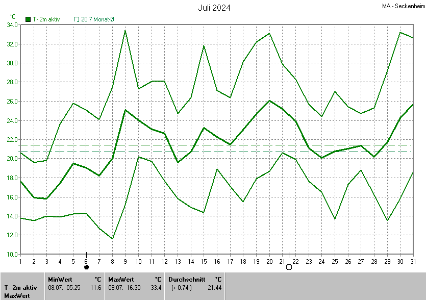 Der wärmste Tag war der 09.07.2024 um 16:30 mit 33.4°C. Am kältesten war es mit 11.6°C am 08.07.2024 um 05:25.