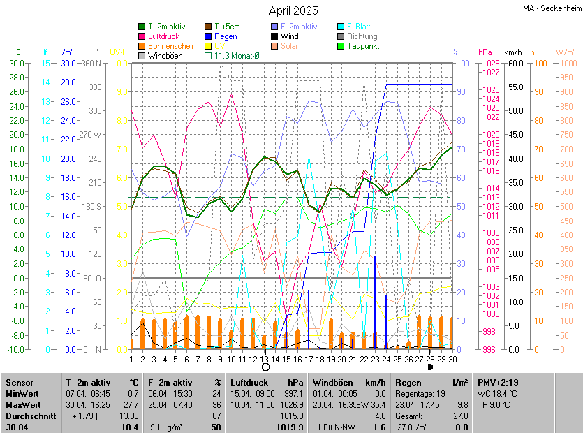 Der wärmste Tag war der 30.04.2025 um 16:25 mit 27.7°C. Am kältesten war es mit 0.7°C am 07.04.2025 um 06:45.