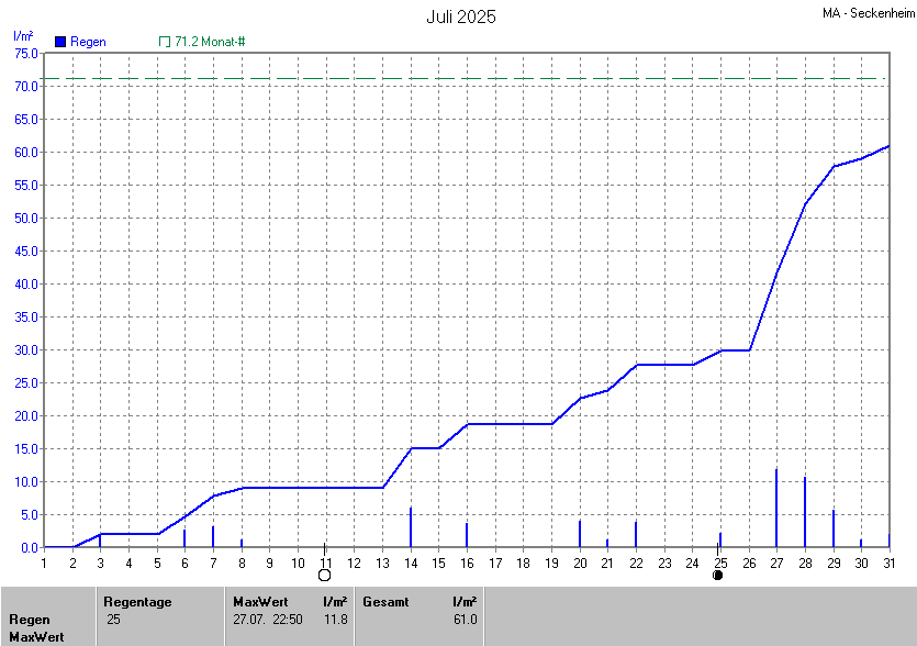 Die gesamte Regenmenge lag bei 61.0l/m² (entspricht: 85.7%) und war damit um -10.2l/m² vom langjährigen Wert entfernt. Niederschlag gab es an 15Tagen. Mehr als 2mm Regen gab es an 11Tagen. Sehr viel Regen mit mehr als 20mm pro Tag gab es an 0Tagen.