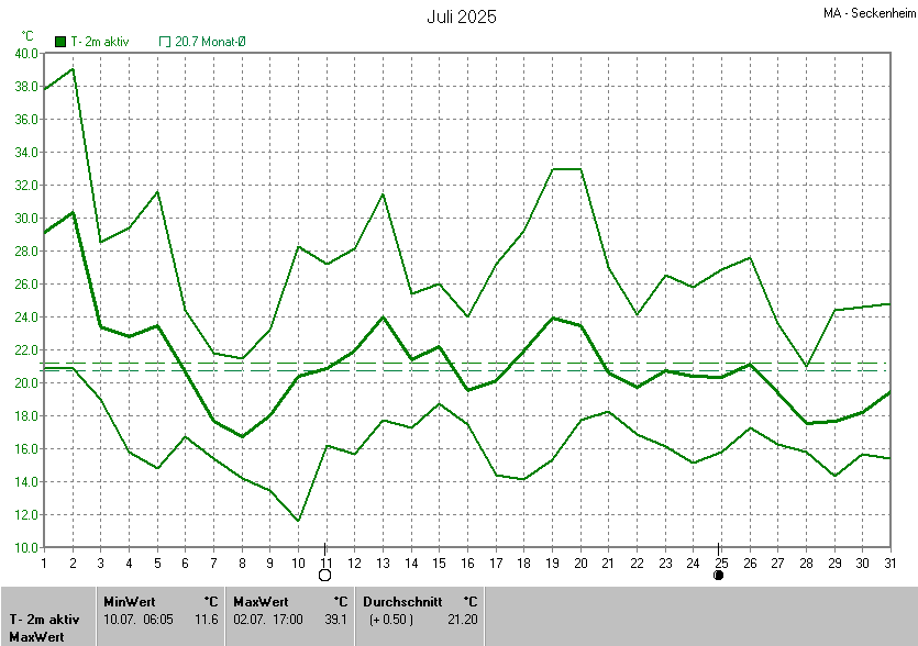 Der wärmste Tag war der 02.07.2025 um 17:00 mit 39.1°C. Am kältesten war es mit 11.6°C am 10.07.2025 um 06:05.