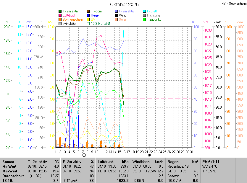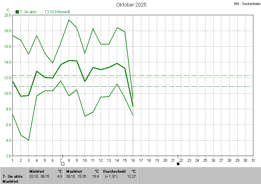 Der wärmste Tag war der 08.10.2025 um 15:35 mit 19.4°C. Am kältesten war es mit 4.0°C am 03.10.2025 um 06:15.