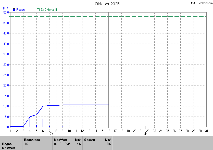 Die gesamte Regenmenge lag bei 10.6l/m² (entspricht: 20.0%) und war damit um -42.4l/m² vom langjährigen Wert entfernt. Niederschlag gab es an 7Tagen. Mehr als 2mm Regen gab es an 2Tagen. Sehr viel Regen mit mehr als 20mm pro Tag gab es an 0Tagen.