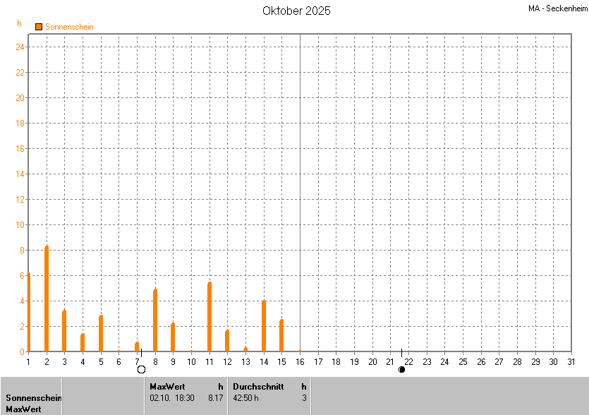 Dargestellt wird die grafische Übersicht für die Sonnenscheinzeit. Zu sehen sind immer die täglichen Sonnenstunden (von 0-24 Uhr):