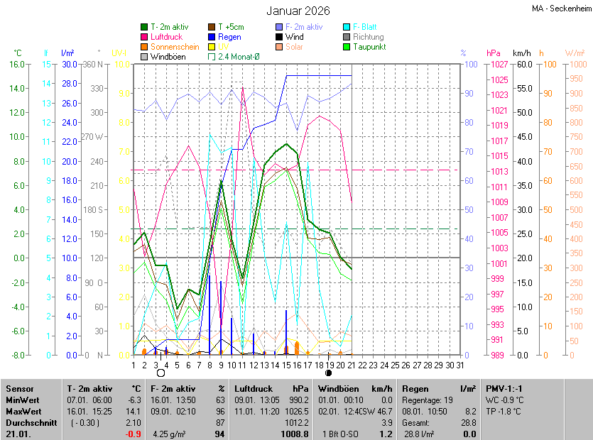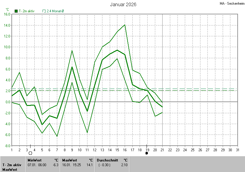 Die Durchschnittstemperatur für den Monat Januar 2026 lag bei 2.10°C. Die Abweichung vom langjährigen Mittel war -0.30°C.