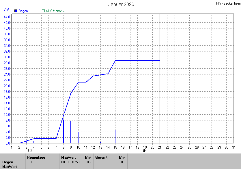Die gesamte Regenmenge lag bei 28.8l/m² (entspricht: 68.7%) und war damit um -13.1l/m² vom langjährigen Wert entfernt. Niederschlag gab es an 9Tagen. Mehr als 2mm Regen gab es an 5Tagen. Sehr viel Regen mit mehr als 20mm pro Tag gab es an 0Tagen.