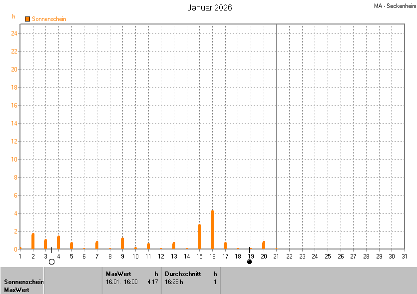 Dargestellt wird die grafische Übersicht für die Sonnenscheinzeit. Zu sehen sind immer die täglichen Sonnenstunden (von 0-24 Uhr):