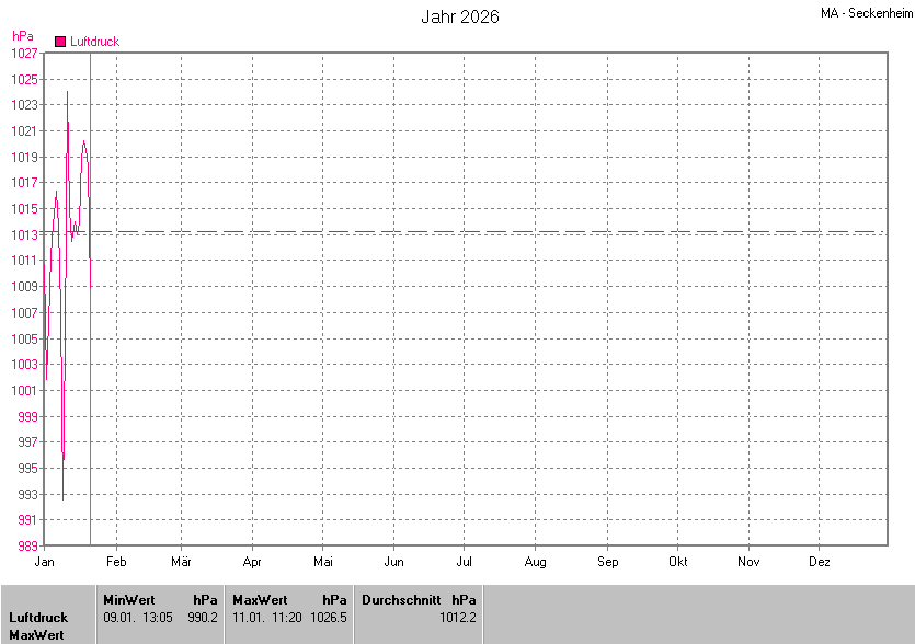 Die Durchschnittstemperatur für das Jahr 2026 lag bei 2.10°C. Die Abweichung vom langjährigen Mittel war -9.10°C.