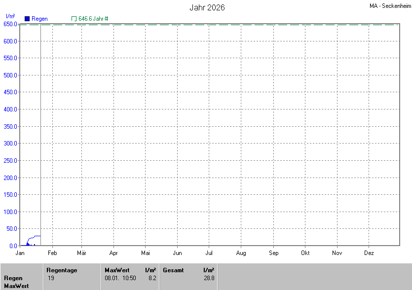 Die gesamte Regenmenge lag bei 28.8l/m² ( 4.5%) und war damit um -617.8l/m² vom langjährigen Wert entfernt. Niederschlag gab es an 9Tagen. Mehr als 2mm Regen gab es an 5Tagen. Sehr viel Regen mit mehr als 20mm pro Tag gab es an 0Tagen.