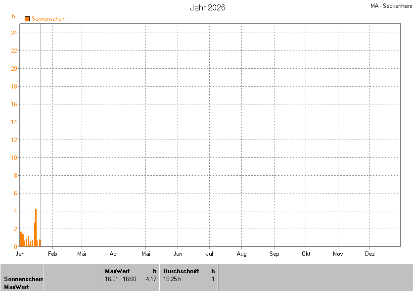 Dargestellt wird die grafische Übersicht für die Sonnenscheinzeit. Zu sehen sind immer die täglichen Zeiten (von 0-24 Uhr):