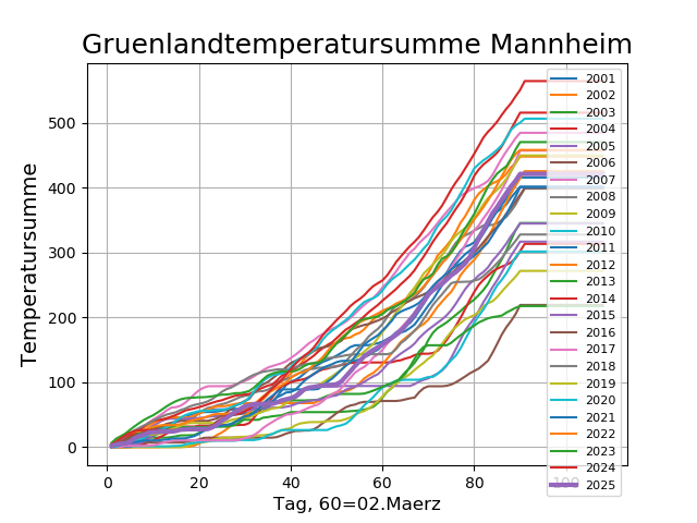 Hier kann die Grünlandtemperatursumme der letzten Jahre abgefragt werden. Bei einem Wert von über 200 ist es wie der Name schon verrät grün und die ersten Blüten sind zu sehen. (Narzissen, Forsythien, erste Mandelblüten, erste japanische Kirschbäume in Schwetzingen...)